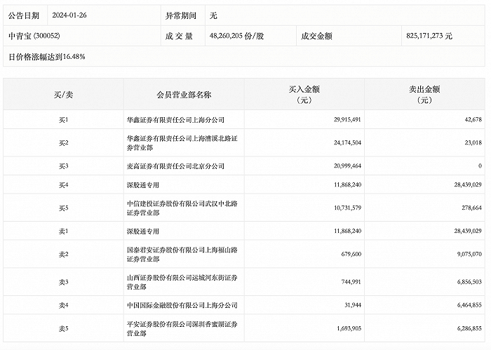 1月26日,中青宝今日涨16.48%,全天换手率达18.48%,振幅达18.29%。龙虎榜数据显示,营业部席位合计净买入4337.3万元。其中,华鑫证券上海分公司、华鑫证券上海漕溪北路证券营业部分别买入2991.55万元、2417.45万元;深股通专用、国泰君安证券上海福山路证券营业部分别卖出2843.90万元、907.51万元。