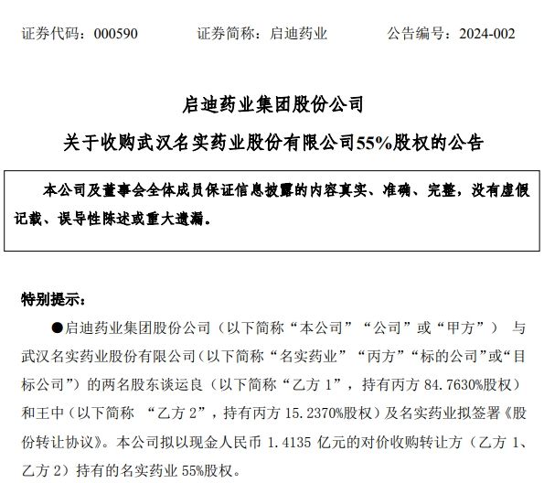 1月12日,启迪药业(000590)逆市上涨0.98%。1月11日晚间,启迪药业公告,与武汉名实药业股份有限公司(简称“名实药业”)的两名股东谈运良(持有名实药业84.76%股权)和王中(持有名实药业15.24%股权)及名实药业拟签署《股份转让协议》,启迪药业拟以现金1.41亿元的对价收购转让方持有的名实药业55%股权。