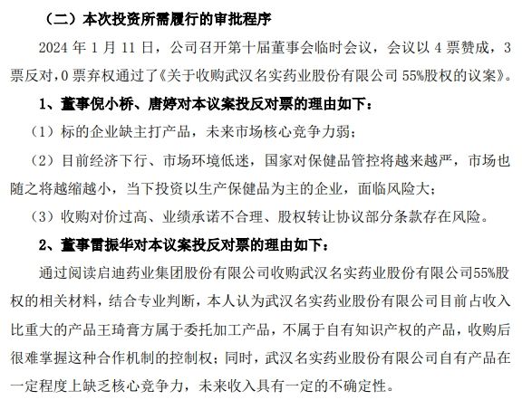 雷振华反对理由为,通过阅读收购相关材料,结合专业判断,认为名实药业目前占收入比重大的产品王琦膏方属于委托加工产品,不属于自有知识产权的产品,收购后很难掌握这种合作机制的控制权;同时,武汉名实药业股份有限公司自有产品在一定程度上缺乏核心竞争力,未来收入具有一定的不确定性。