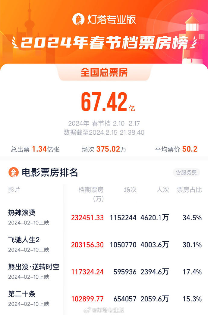 据@灯塔专业版消息,据灯塔专业版数据显示,截至2月15日21时38分,2024年春节档(2月10日—2月17日)总场次(含预售)突破375万场,刷新中国影史春节档总场次纪录!