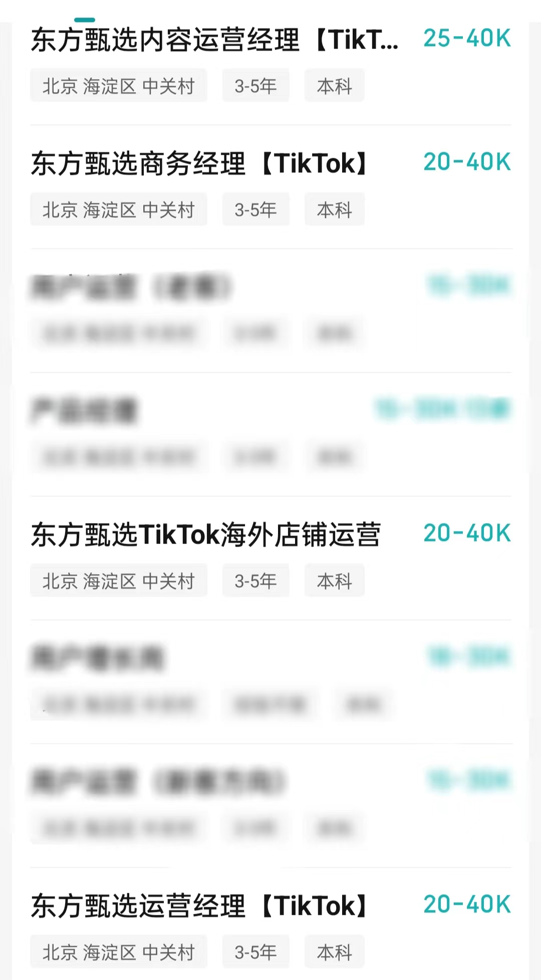 东方甄选已开始在平台上招聘TikTok电商运营相关岗位。