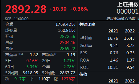 今日上午,大盘低开下探后再度开启反弹模式,上证指数领涨。盘面上,宁德时代盘初即单边走低再度带崩创业板指,随后本轮弱反弹一直未见动静的芯片股突然爆发,带动指数回升。截至上午收盘,上证指数涨0.36%报2892.28点,深证成指跌0.01%,创业板指跌0.38%,北证50跌1.08%。A股半日成交4074.5亿元,环比基本持平;北向资金净买入11亿元。